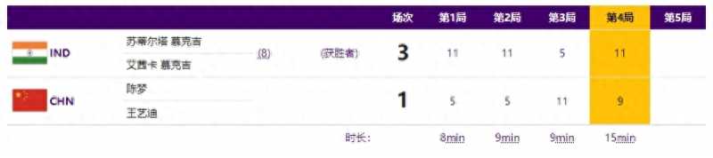 本场比赛前两局,陈梦/王艺迪的主动失误过多,让印度组合仅用8分钟&9分钟就拿下两局。虽然第三局拿下一局,但陈梦/王艺迪在第四局依旧以9-11落败。