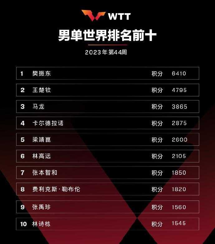 - 国际乒联男单世界排名:王楚钦、林诗栋前二,梁靖崑第七