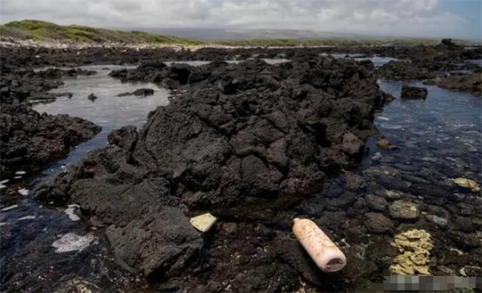 在宽阔的海滩上,塑料是永远存在的,海浪拍打着锯齿状的黑色熔岩,闪烁着蓝色、粉色和白色的微塑性斑点。