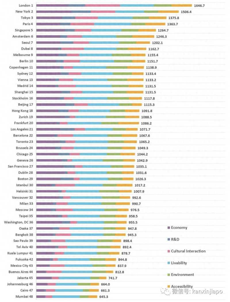 排行榜共48个城市,按照经济、研究开发、文化交流、居住、环境及交通便利性6个方面共70个指标进行评估。