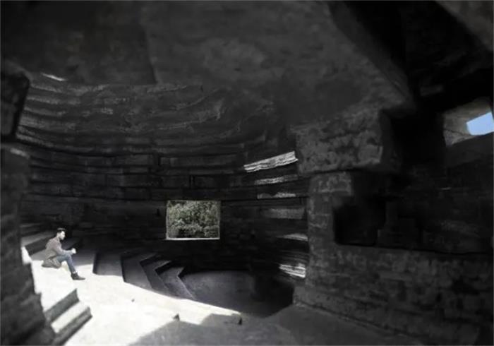 巨石结构被雕刻成一个凹凸不平的内部形式,旨在优化音质在巨石内达到最好的混响效果。