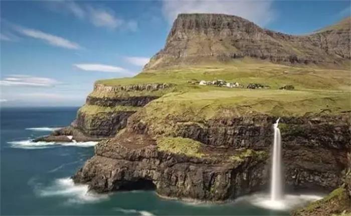 丹麦加萨达鲁村,坐落在法罗群岛海岸线上,在悬崖边可以俯瞰北大西洋的墨西哥暖流景象。