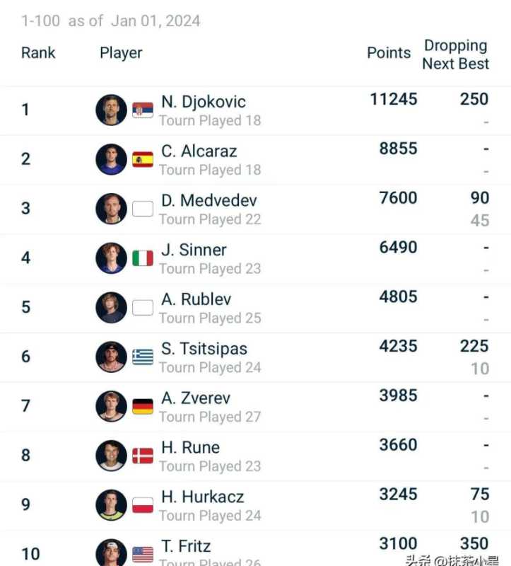 国际职业男子网球协会(ATP)于近期发布了2024年1月份的男子网球世界排名榜单。经过严谨的评估与审核,成绩卓越的塞尔维亚名将诺瓦克·德约科维奇依旧保持在世界排名第一的高峰之上,并将稳固态势,其周总数已达到了惊人的406周。
