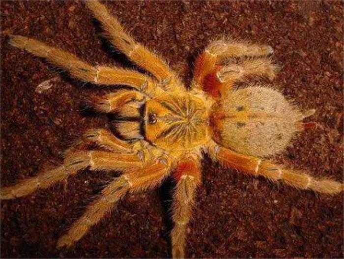 原产于法属圭亚那、苏里南的热带雨林,是一个经典的宠物捕鸟蛛种类,这是一个被发现较早的种类,一只成年的火焰黄膝脚上的黄色斑纹以及金黄色的背甲是非常醒目和吸引人的。成年体长14~15厘米足展。