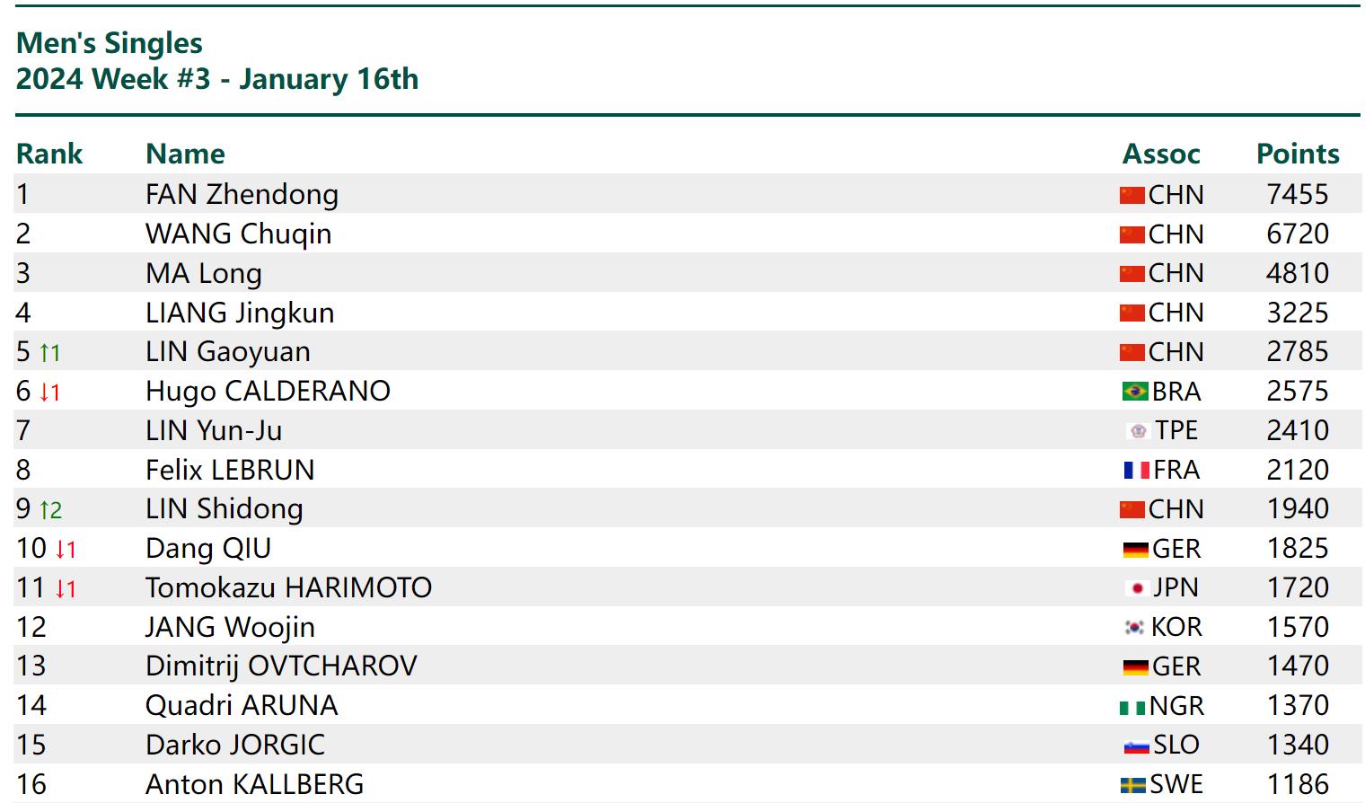 北京时间1月16日,国际乒联公布2024年第3周的世界排名榜单。受WTT多哈球星赛的结果以及部分旧积分被清空影响,许多人的位置发生变动,国乒蝉联男单、女单、男双、混双第一,韩国队保持女双第一。