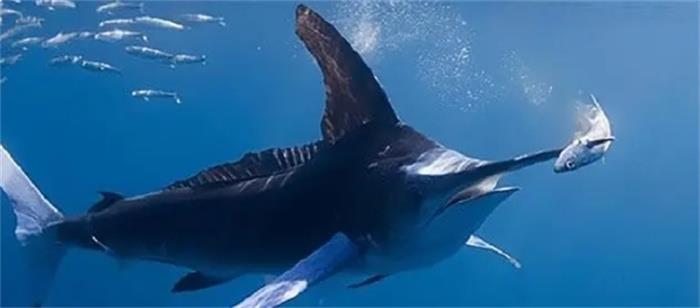 剑鱼,鲈形目剑鱼科剑鱼属洄游鱼类,又称箭鱼。剑鱼体长粗壮,身体长度可达5米,体重500千克;长而尖呈剑状的吻部,占全长的三分之一。剑鱼在中国分布于东海南部、南海和台湾附近海域,在世界各大洋的温热带海域包括地中海均有分布。剑鱼性格凶猛,游泳速度极快,时速可达120千米,在面对较大的猎物时,它们会用坚硬的上颌左右击打猎物,将猎物击晕或击杀,剑鱼是它们栖息深度范围内的顶端食肉动物,以金枪鱼、蜞鳅、飞鱼、鱿鱼和其它头足类动物和甲壳类动物为食。