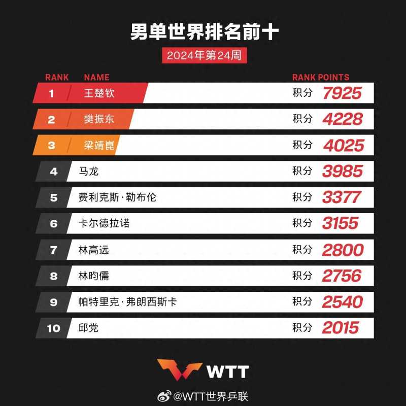 北京时间6月11日,国际乒联2024年第24周世界排名出炉。