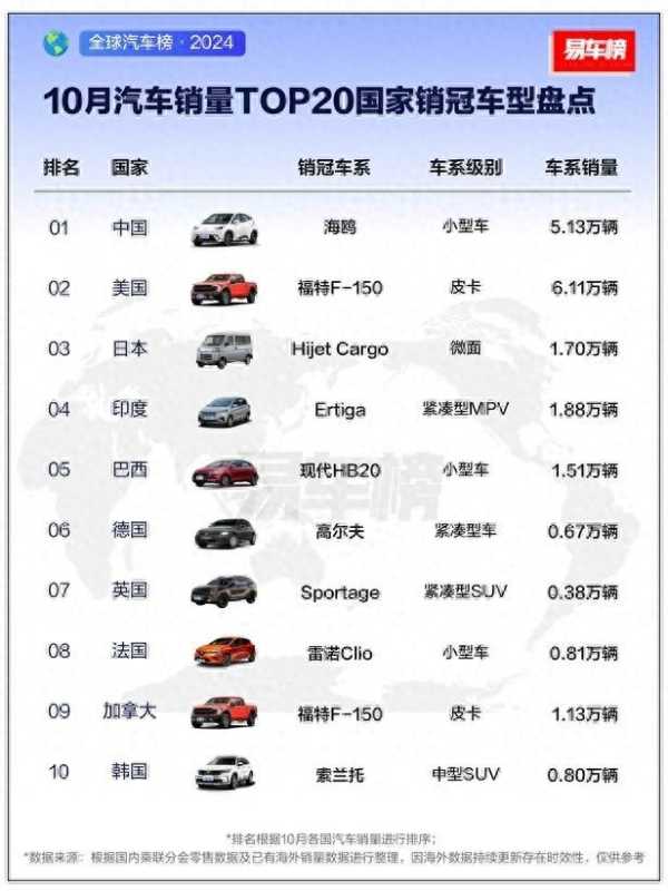 易车榜权威发布了10月份全球汽车销量Top20国家的销冠车型盘点,揭示了各国消费者的购车偏好和市场趋势。