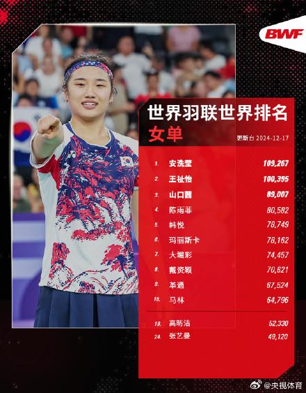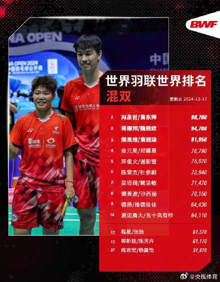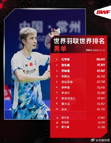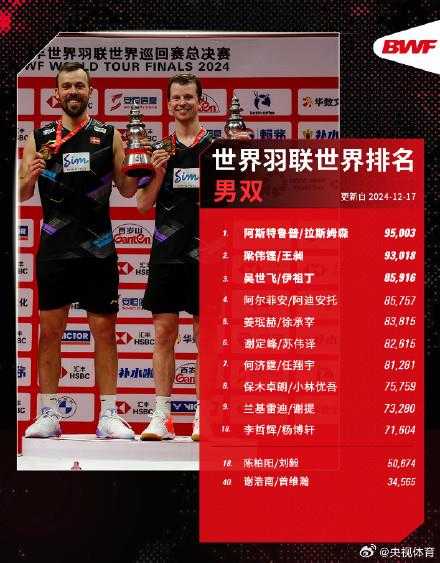 世界羽联公布2024年第51周世界排名,石宇奇、安洗莹、刘圣书/谭宁、冯彦哲/黄东萍继续位列各单项第一,丹麦组合阿斯特鲁普/拉斯姆森超越梁伟铿/王昶,首次登顶男双世界第一。