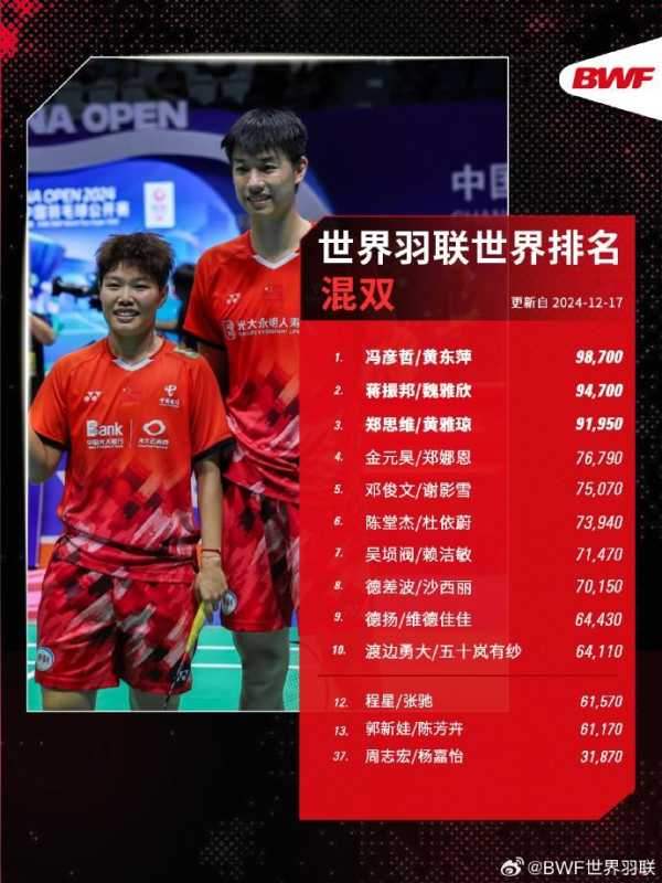混双方面。冯彦哲/黄东萍,蒋振邦/魏雅欣,郑思维/黄雅琼分列前三位。