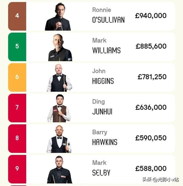 “七五三杰”老家伙排名靠在了一起,火箭在决赛中获得亚军,凭借20万英镑的奖金排名从第5上升到了第4。老马和老张分别下降一位,排在了第5、第6。丁主任虽然晋级16强,但在16进8轮次惨遭霍金斯绝杀,排名也下降1位,来到了第7。霍金斯排名第8,塞尔比则由第7下滑至第9。