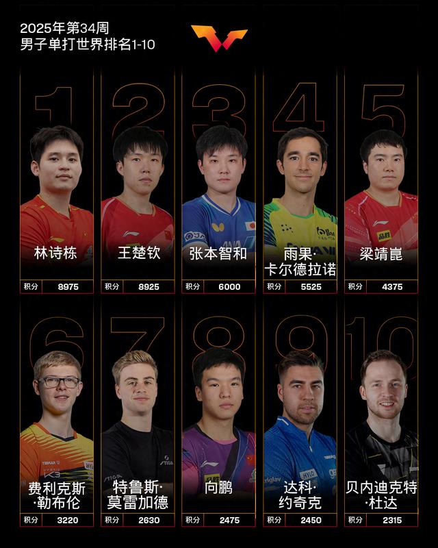 - 国际乒联男单世界排名:王楚钦、林诗栋前二,梁靖崑第七