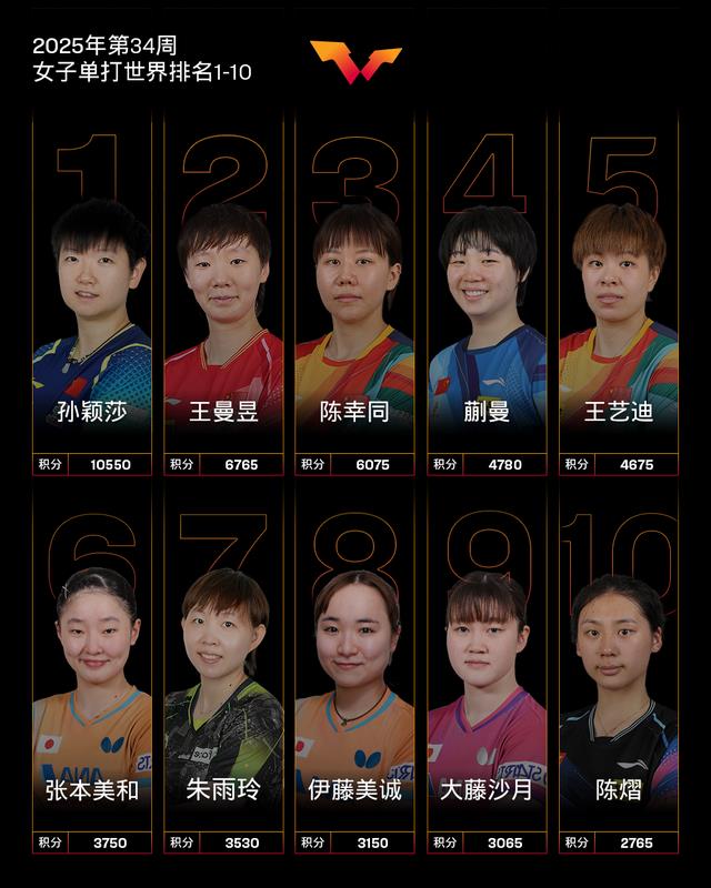 中国队球员孙颖莎、王曼昱、陈幸同、蒯曼、王艺迪位列前五,陈熠位列第十。