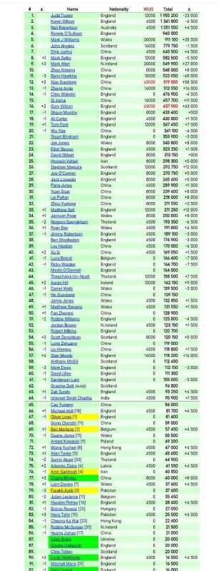 丁俊晖第七没变,赵心童第十,肖国栋第八,加上张安达、常冰玉,前16里中国选手第一次凑够一桌麻将还带替补。