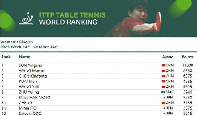 10月14日,国际乒联更新2025年第42周世界排名:女单方面,孙颖莎11600分连续第170周霸榜第一,王曼昱8850分排名第二,陈幸同6075分排名第三。