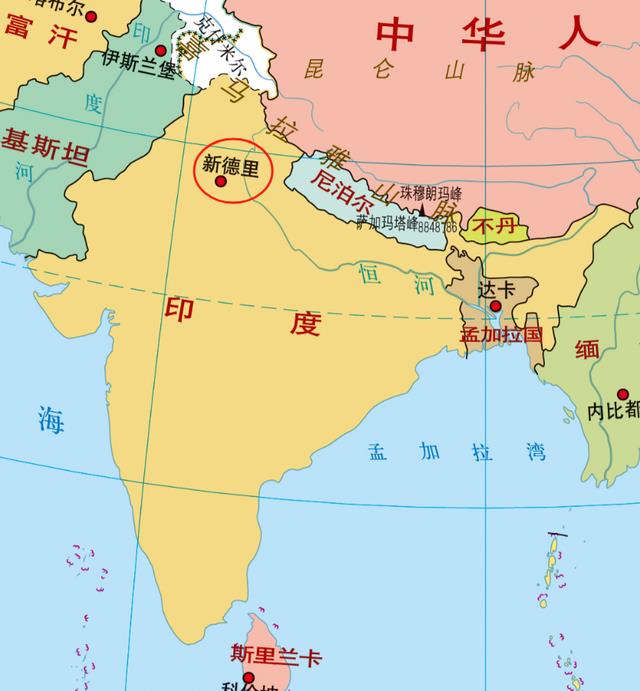 第7大国、印度,首都新德里,位于印度的西北角,离中国青藏高原,离巴基斯坦都很近,颇有“天子守国门”的意味,离本国南部和东部地区很远。