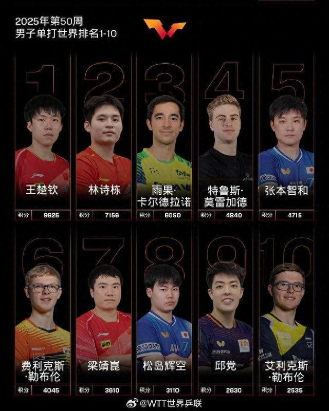 - 最新世界排名:王楚钦林诗栋第1第2,樊振东无需排名,勒布伦第4