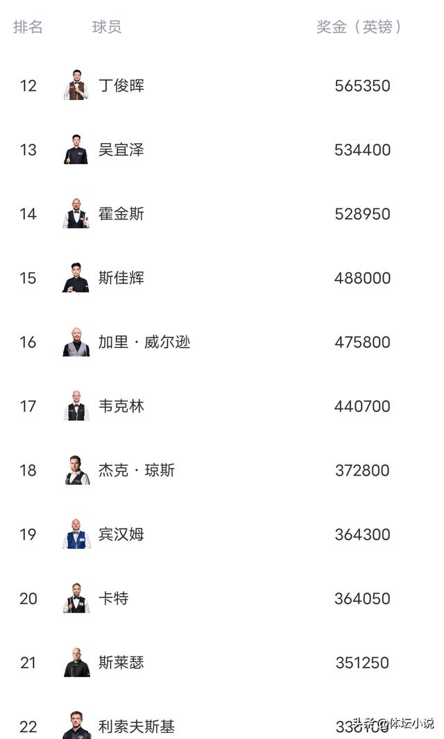 斯诺克最新世界排名:特鲁姆普领跑,赵心童第10、丁俊晖第12 直播吧12月8日讯 斯诺克英锦赛决赛,塞尔比击败特鲁姆普夺冠。凭借英锦赛夺冠,塞尔比世界排名从第11位提升到第6位。中国选手方面,丁俊晖扣掉同期亚军奖金,跌到第12,赵心童排名第10。附斯诺克最新世界排名(前16 ... 世界排行12-10