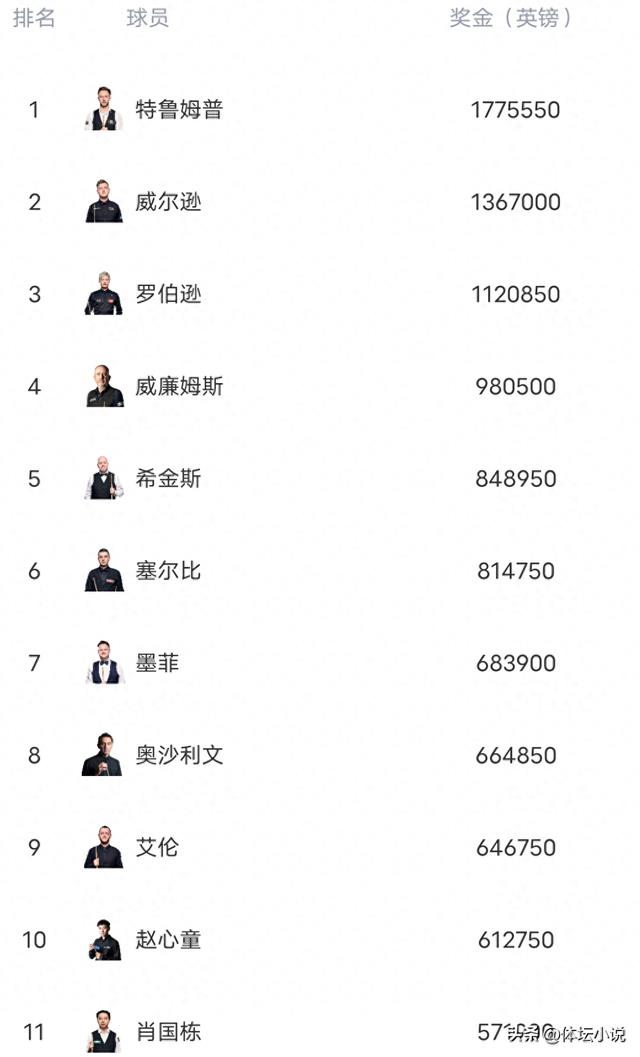 特鲁姆普本赛季非常悲催,打进三个赛事的决赛,全部获得亚军,北爱尔兰公开赛输给利索夫斯基,冠中冠和英锦赛全部输给了塞尔比,不过拿到10万英镑的奖金,排名继续留在第一位断层领先,牢牢霸占榜首,不过这两个赛季特鲁姆普有点悲催,上个赛季被凯伦-威尔逊压制,这个赛季被塞尔比压制,拿得亚军太多了,不得不说特鲁姆普三大赛表现确实辣眼睛!