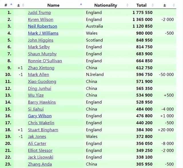 而今年世锦赛冠军赵心童上升一位来到第九,“小钢炮”马克-艾伦下滑一位排在第十。接下来的第十一位到第十六位同样没有变化:肖国栋、丁俊晖、吴宜泽、巴里-霍金斯、斯佳辉、加里-威尔逊。