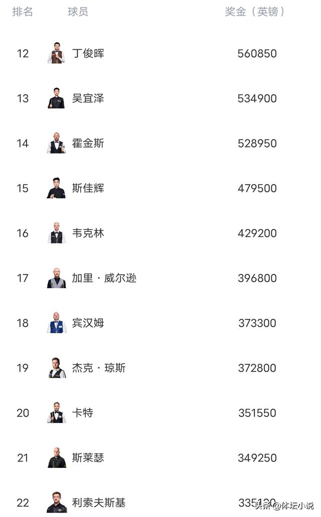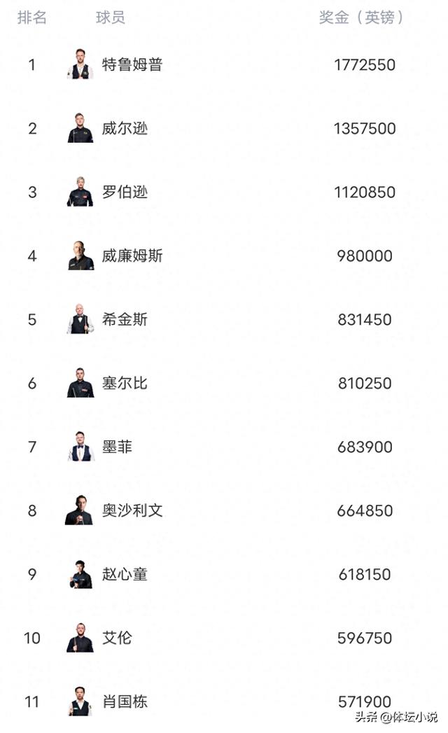 其他球员方面,特鲁姆普碰高居第一,和第二名的凯伦-威尔逊,以及罗伯逊是三个破百万英镑的球员,马克-威廉姆斯,排名第四距离破百万英镑已经近在咫尺了。奥沙利文本赛季状态低迷,战绩糟糕,持续下降来到了第八位,仅高出中国球员赵心童一位!