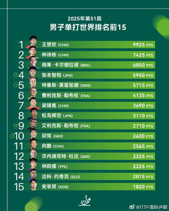9925分,王楚钦力压日本张本智和,最新世界排名:霸气世界第一 北京时间12月17日消息,国际乒联2025年第51周世界排名火热出炉。男子单打方面,3名中国选手位居前十,其中“大头”王楚钦、“小石头”林诗栋高居前两位。从排名积分来看,王楚钦并未受到WTT受伤无缘冠军的任何影响, ... 世界排行12-17