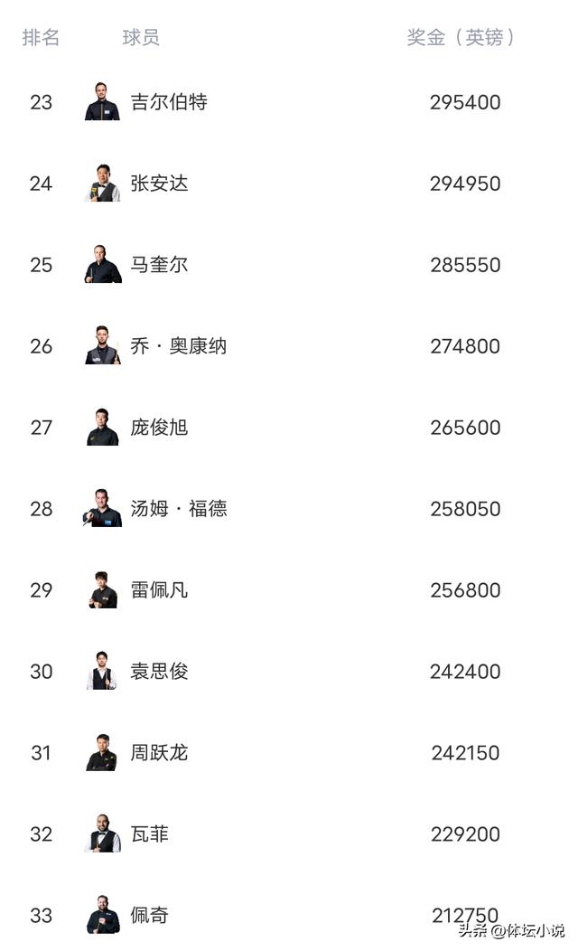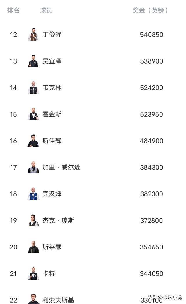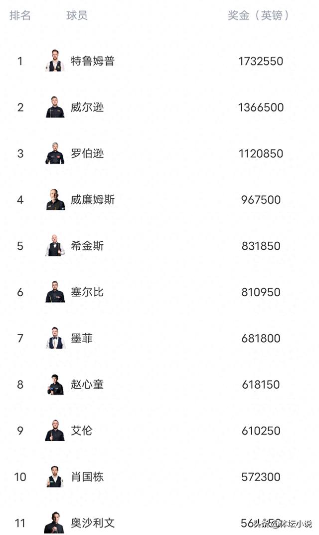 其他人排名变化不大,奥沙利文由于长时间未能夺取排名赛冠军,导致排名持续下降来到了第11位,中国还是5人位居前十六,赵心童中国最高排名第八,丁俊晖第12位,新科苏格兰公开赛冠军韦克林杀到第14位!