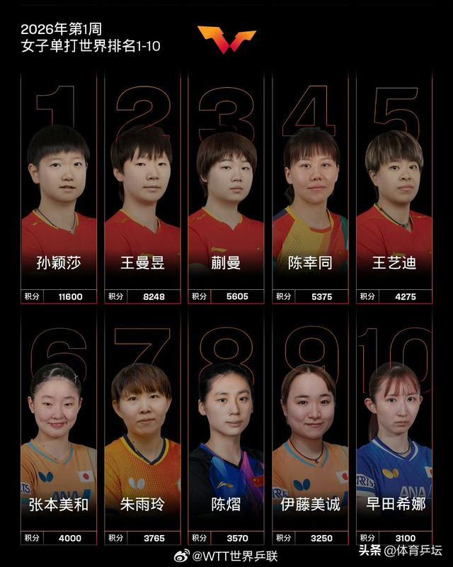 最新世界排名公布!王楚钦孙颖莎稳居首位,男乒仅有三位居前十!