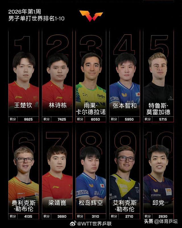 - 国际乒联最新世界排名公布,王楚钦、林诗栋位列男子单打前二