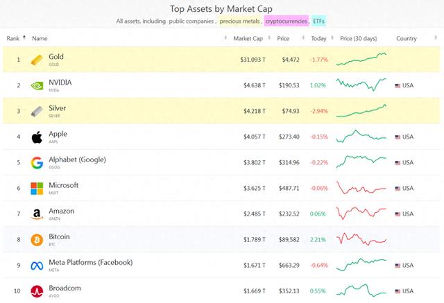 黄金排名第一,白银排名晋升第三,比特币排名第八。