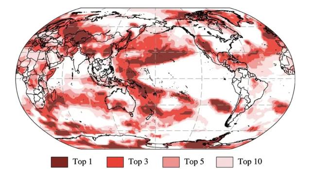 2025年东亚北部和南部、中亚大部、欧洲东部、北美洲北部和南部、南极洲大部及太平洋西北部、西部以及东南部、印度洋南部和大西洋中部年平均温度均位列历史前三且中心区域突破高温历史纪录(图3)。