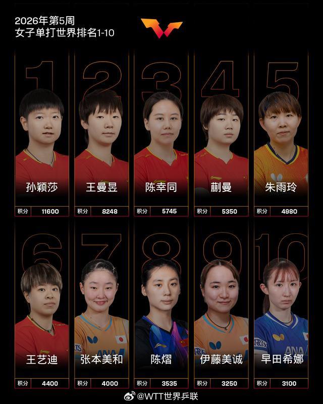 女子单打,中国队球员孙颖莎、王曼昱、陈幸同、蒯曼位列前四,王艺迪位列第六,陈熠位列第八。