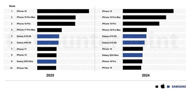 近日,市场调研机构 CounterPoint Research 公布了 2025 年全球最畅销智能手机 TOP10 榜单。