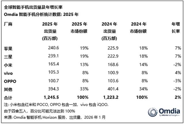 如上图所见,Omdia统计的数据显示2025年全球份额TOP10手机厂商分别是❶苹果(19%,同比增长7%)❷三星(19%,同比增长7%)❸小米(13%,同比下滑2%)❹vivo(8%,同比增长4%)❺OPPO(8%,同比下滑3%)❻传音(8%,同比下滑8%)❼荣耀(6%,同比增长11%)❽联想(5%,同比增长6%)❾华为(4%,同比增长2%)❿realme(3%,同比下滑13%);其它品牌合计约6%份额。