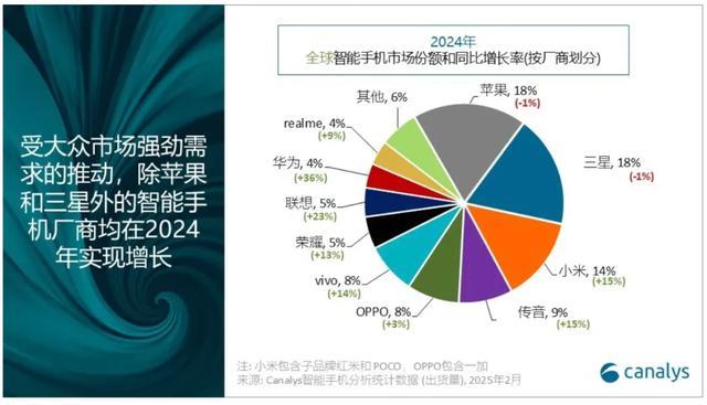 作为补充,2024年全球市场份额TOP10依次是:❶苹果(18%)❷三星(18%)❸小米(14%) ❹传音(9%) ❺OPPO(8%)❻vivo(8%) ❼荣耀(5%) ❽联想(5%) ❾华为(4%) ❿真我(4%);其它品牌合计约6%。供大家参考~