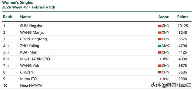 王曼昱和陈幸同积分也稳定,而蒯曼受到新加坡大满贯积分到期影响,下滑到世界第五,朱雨玲补位,女乒四个种子位,暂时失手。
