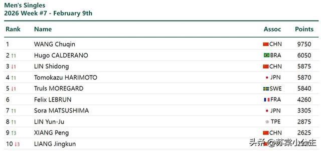 北京时间2026年2月9日,国际乒联公布第7周的世界排名,本周由于新加坡大满贯的积分到期,加上亚洲杯、欧洲杯,美洲杯的新增加分,所以排名波动非常大。