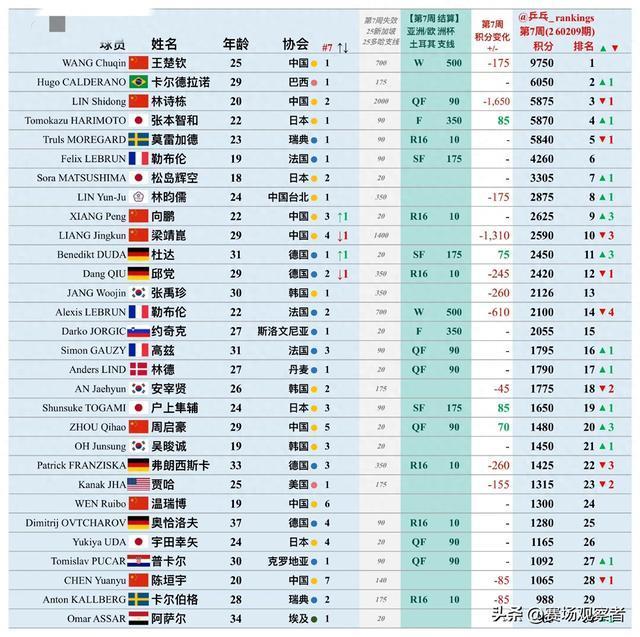 世界排名更新,第二易主男队优势全无,只剩王楚钦苦苦支撑 随着乒乓球亚洲杯和欧洲十六强赛的结束,国际乒联的世界排名系统迎来了新一轮更新。王楚钦依然坚守着世界第一的王座,但身后,林诗栋因积分到期清零惨遭巴西名将雨果反超,三号主力梁靖崑则下滑到了第十位。成功卫冕 ... 世界排行02-10