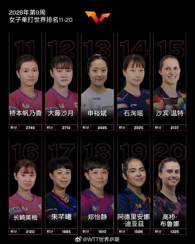 直播吧2月23日讯 今日,国际乒联公布了2026年第9周女单世界排名,前十球员里有6名国乒选手,其中孙颖莎、王曼昱、陈幸同位列前三,蒯曼第5位,王艺迪第7,陈熠第8。