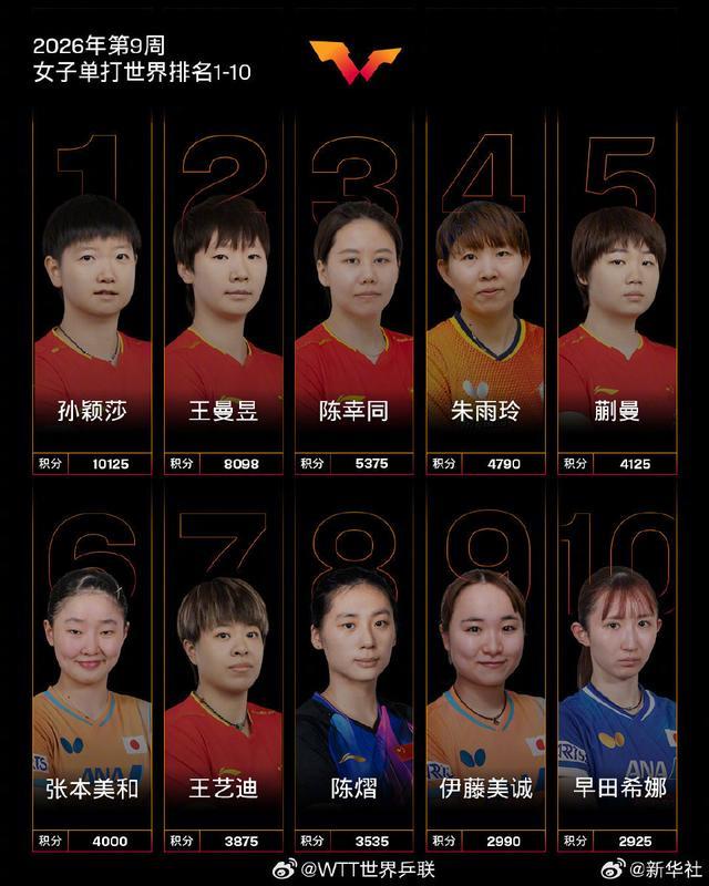 国际乒联女单最新一期世界排名:前十国乒占6席,孙颖莎继续领跑 直播吧2月23日讯 今日,国际乒联公布了2026年第9周女单世界排名,前十球员里有6名国乒选手,其中孙颖莎、王曼昱、陈幸同位列前三,蒯曼第5位,王艺迪第7,陈熠第8。其他中国队球员,石洵瑶排名第14,覃予萱排名第37 ... 世界排行02-24