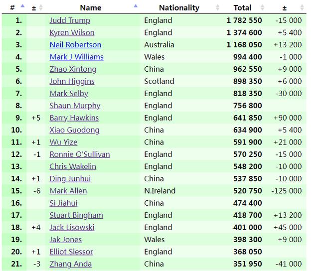 - 最新世界排名出炉:赵心童排名第5,丁俊晖跌至15