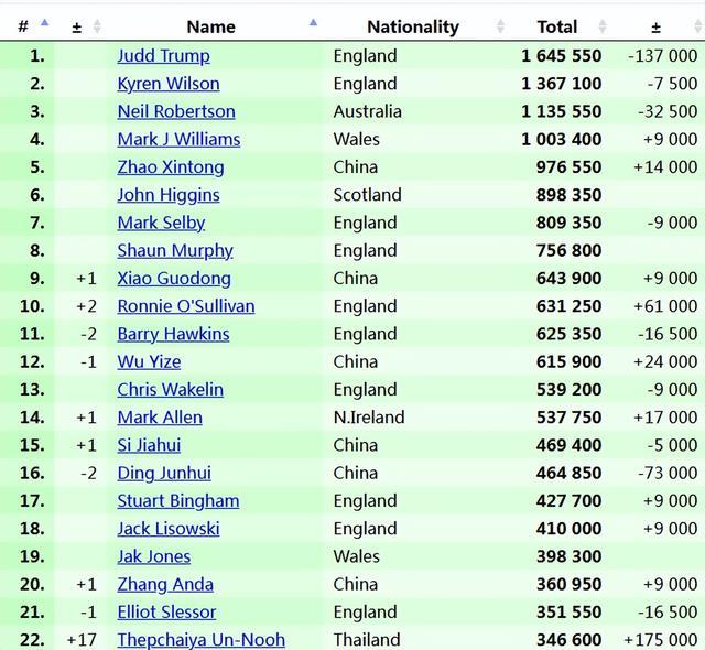 最新世界排名:奥沙利文第10,吴宜泽第12,小特第1,冠军升17位