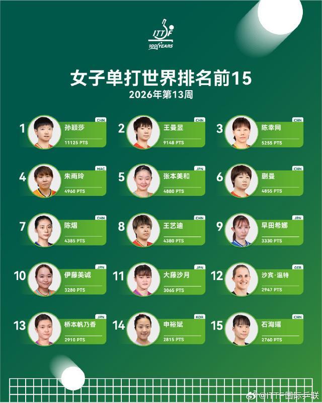 国际乒联2026年第13周世界排名,以WTT支线赛瓦拉日丁站为时间节点,这一站比赛,几乎与WTT重庆冠军赛同时进行。作为一站WTT1000赛事,重庆冠军赛吸引了众多高手参赛,经过激烈争夺,中国选手蒯曼、王艺迪,日本选手张本美和、大藤沙月打进女单四强。