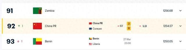 FIFA官网实时更新世界排名,国足上升1位至世界第92,库拉索仍居世界第81。