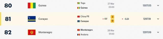 2-0领先库拉索!FIFA官网实时更新国足排名,上升1位至世界第92