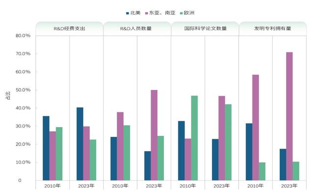 R&D经费支出方面,亚洲地区的东亚和南亚国家占全球份额上升从2010年的27.2%上升至2023年的30.0%,增加2.8个百分点;北美国家份额从2010年的35.6%上升至2023年的40.4%;欧洲国家份额下降较为显著,从2010年的29.5%下降至2023年的22.6%,减少6.9个百分点。