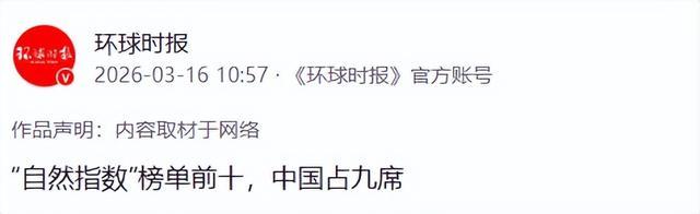 “自然指数”榜单前十,中国占九席——2026-03-16 10:57·环球时报