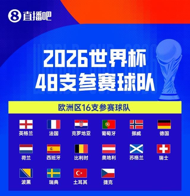 欧洲区晋级2026世界杯的16队包括:奥地利、比利时、克罗地亚、英格兰、法国、德国、荷兰、挪威、葡萄牙、苏格兰、西班牙、瑞士、波黑、捷克、瑞典、土耳其。