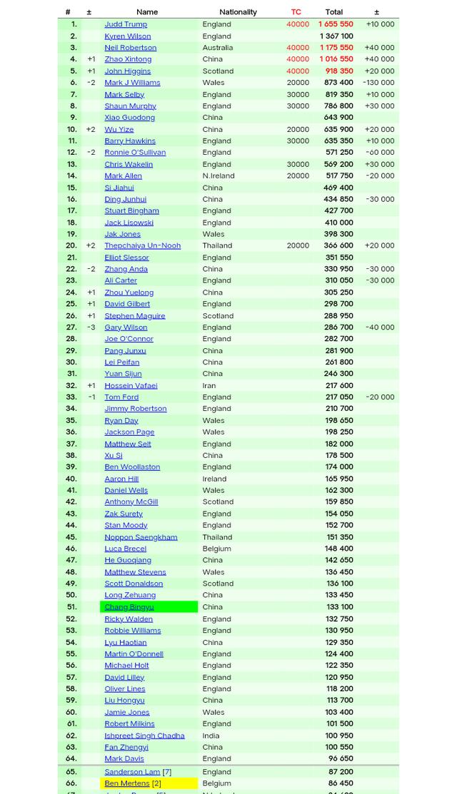 上一站冠军塔猜亚一轮游,世界排名上升两位来到第20,也让丁俊晖压哨跻身克鲁斯堡,后者与凯伦有着一样的赛季排名赛表现,目前位居第16。