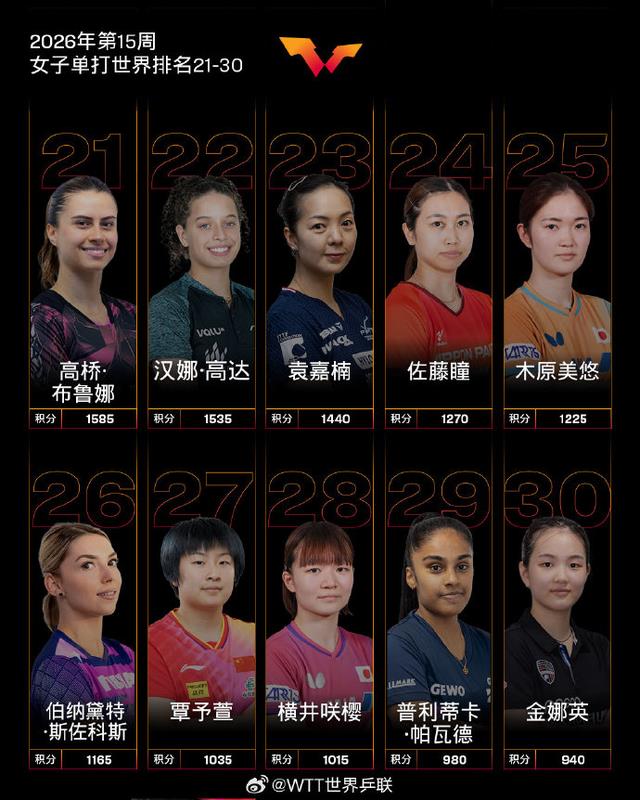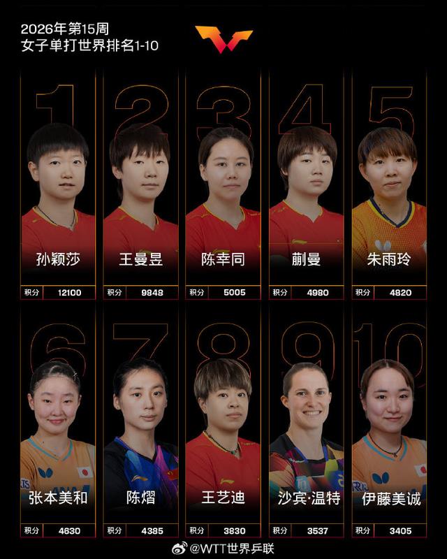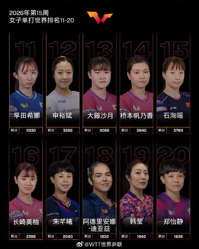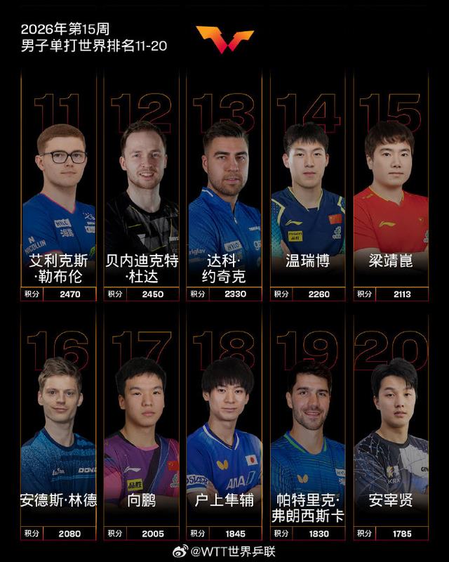 4月6日,WTT世界乒联公布国际乒联2026年第15周世界排名: